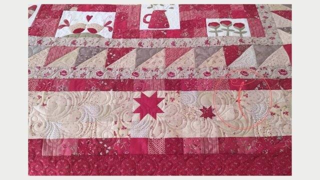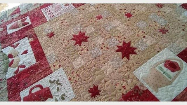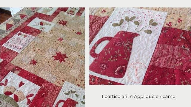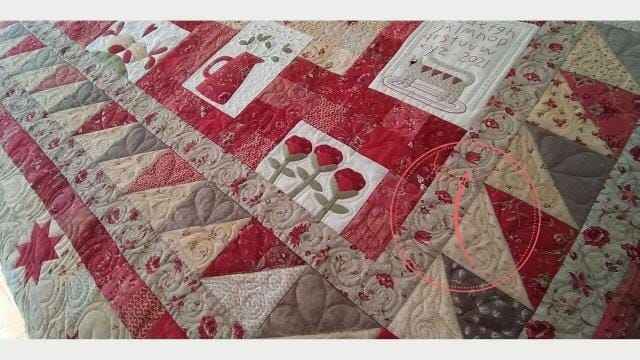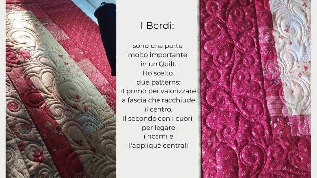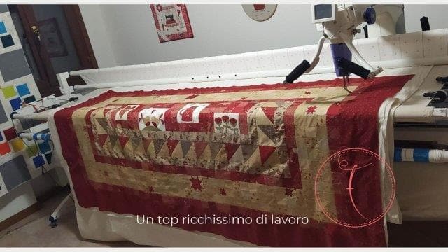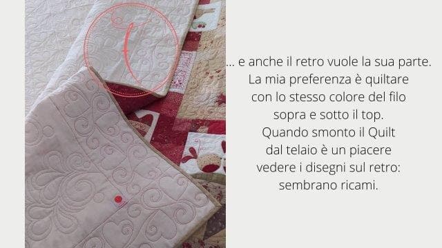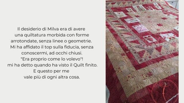 Milva mi ha conosciuta sui social e mi ha affidato il suo Quilt con estrema fiducia. Unica richiesta: quiltature sinuose senza forme geometriche. Subito mi sono un po’ preoccupata, vista la grandezza del quilt ma poi tutta la trapuntatura si è rivelata strada facendo. Come sempre ogni Quilt mi dice cosa fare!